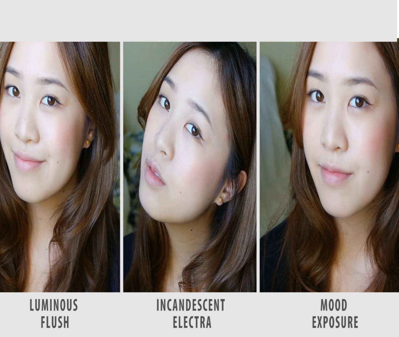 As my video said, luminous flush was more of a rosy pink shade, while incandescent electra was more of a true pink glow. Mood exposure was the deepest shade of red/pink in the palette. Here are some video stills of each shade. Luminous Flush: