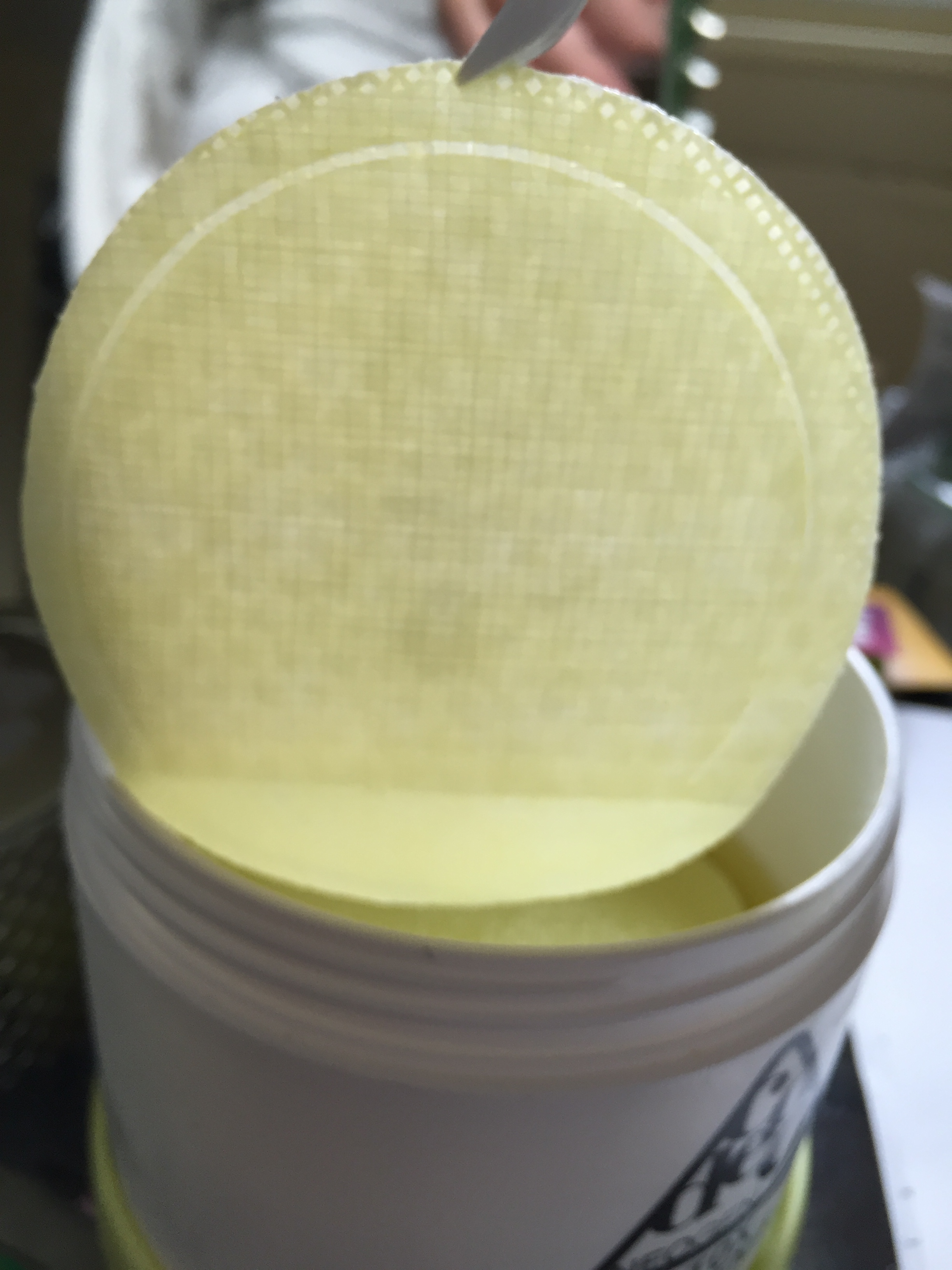 Inside the white container had yellow gauze pads on one side and cotton pads on the other side.